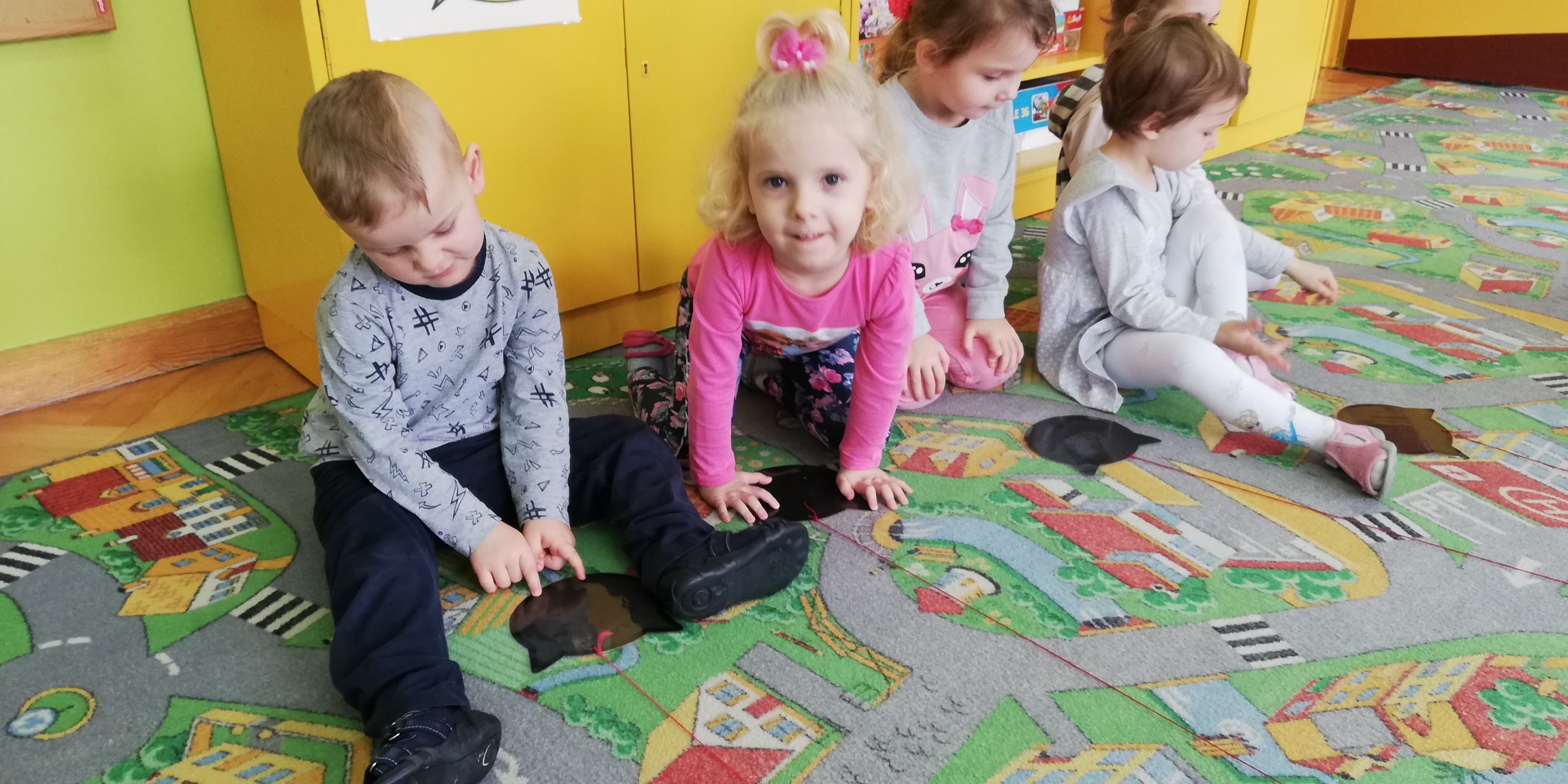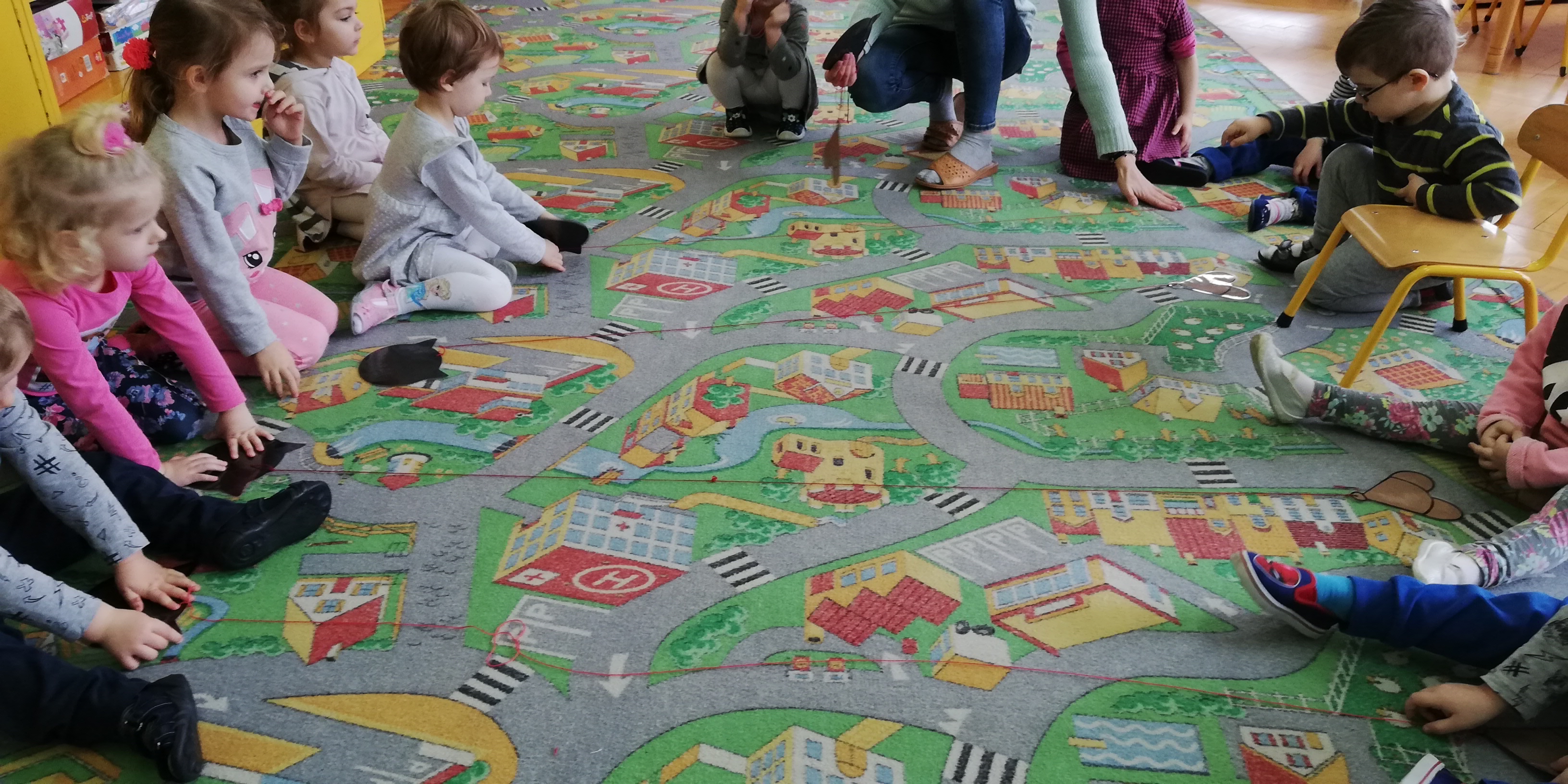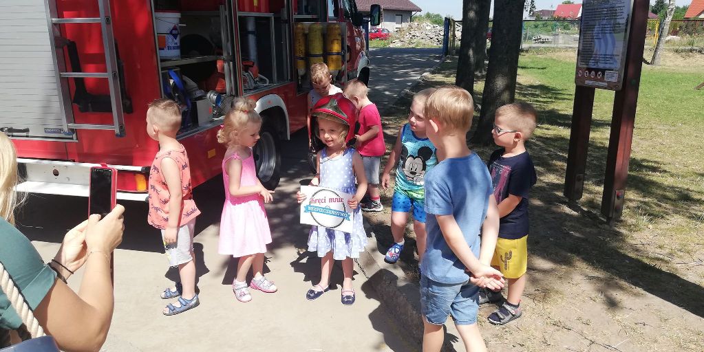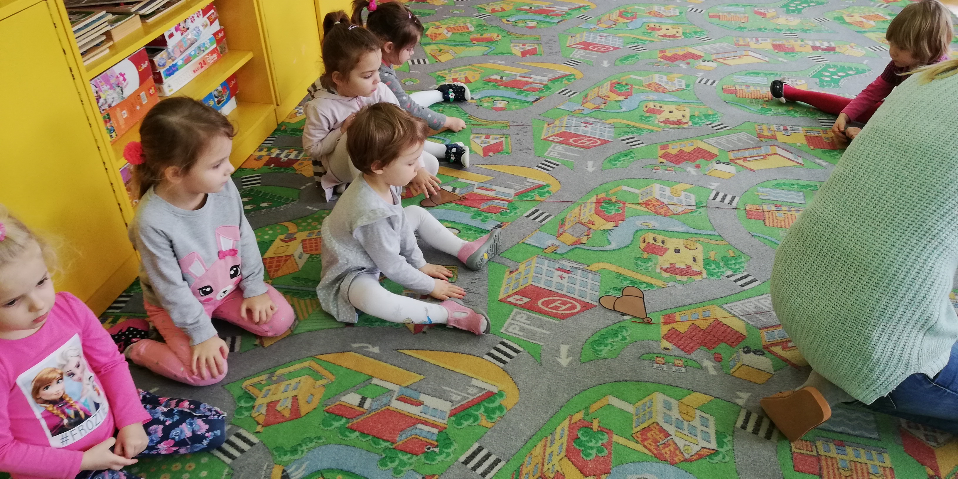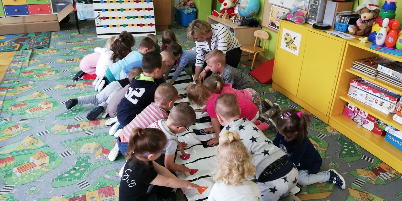 Maluszki dowiedziały się, że przechodzimy przez jezdnię w miejscu dla pieszych – zebrze, że przed przejściem trzeba się rozejrzeć, na czerwonym świetle trzeba stać, a na zielonym można przejść przez jezdnię.